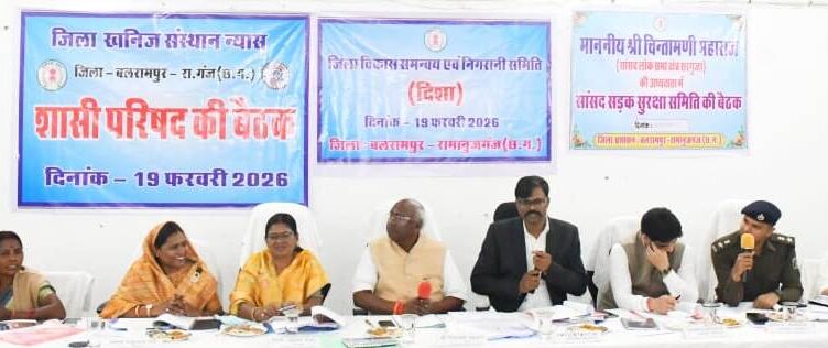 रायपुर, 19 फरवरी 2026 : बलरामपुर जिले के जनपद पंचायत राजपुर के सभाकक्ष में जिला खनिज संस्थान न्यास की शासी परिषद, सांसद सड़क सुरक्षा समिति एवं जिला पशु रोगी कल्याण समिति की बैठक सम्पन्न हुई। बैठक में आदिम जाति विकास मंत्री श्री रामविचार नेताम वर्चुअल रूप से जुड़े। इस दौरान सरगुजा सांसद श्री चिंतामणि महाराज, सामरी विधायक श्रीमती उद्देश्वरी पैंकरा, प्रतापपुर विधायक श्रीमती शकुंतला पोर्ते, जिला पंचायत अध्यक्ष श्रीमती हीरामुनी निकुंज, कलेक्टर श्री राजेंद्र कटारा, पुलिस अधीक्षक श्री वैभव बैंकर, वनमंडलाधिकारी श्री आलोक वाजपेयी, जिला पंचायत सीईओ श्रीमती नयनतारा सिंह तोमर, अपर कलेक्टर श्री आर.एन. पाण्डेय, जनपद एवं नगरीय निकायों के अध्यक्ष व उपाध्यक्ष सहित अन्य जनप्रतिनिधि एवं विभागीय अधिकारी उपस्थित थे।