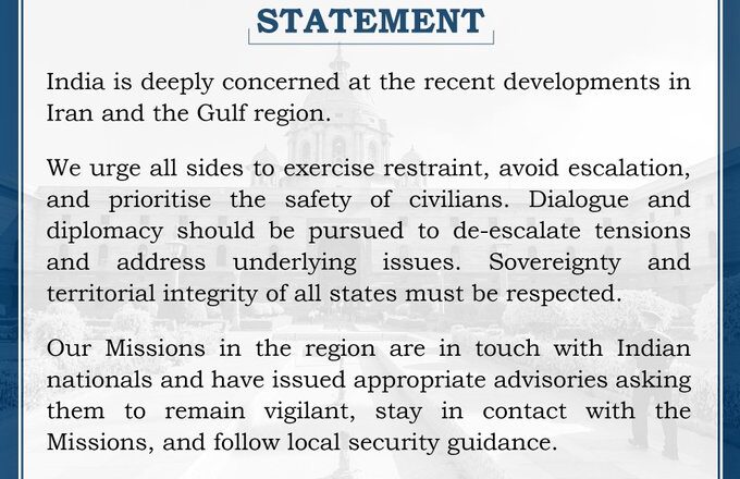 नई दिल्ली (SHABD):खाड़ी देशों में तनावपूर्ण हालात पर भारत ने गहरी चिंता व्यक्त की है। भारत के विदेश मंत्रालय ने बयान जारी किया है और सभी पक्षों से संयम बरतने की अपील की है। भारत सरकार ने स्थिति को और न बढ़ाने के साथ ही नागरिकों की सुरक्षा को प्राथमिकता देने की अपील भी की गई है। भारत ने कहा है कि मूल मुद्दों के समाधान के लिए संवाद और कूटनीति का रास्ता अपनाया जाना चाहिए। साथ ही खाड़ी देशों में मौजूद भारतीयों को सतर्क रहने और दूतावासों के सम्पर्क में रहने की अपील भी की गई है।