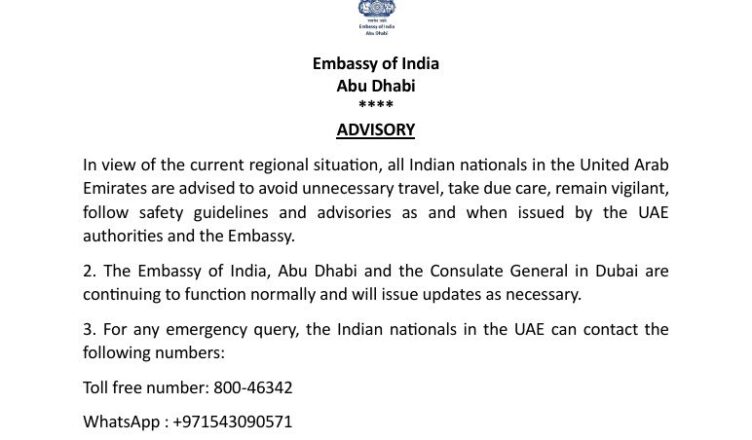 नई दिल्ली (SHABD):यूएई में ईरान के हमलों की खबर के बीच अबू धाबी में भारतीय दूतावास ने एडवाइजरी जारी की है। दुबई और अबूधाबी में रहने वाले भारतीयों से दूतावास के सम्पर्क में रहने के लिए कहा गया है। इसके लिए टोल फ्री नम्बर और सोशल मीडिया नम्बर भी जारी किए गए हैं। वहीं सऊदी अरब में भी भारतीय दूतावास ने एडवाइजरी जारी की है।