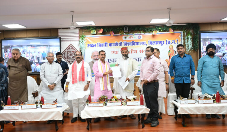 रायपुर, 16 मई 2025 : केंद्रीय आवास एवं शहरी विकास राज्य मंत्री श्री तोखन साहू के मुख्य आतिथ्य में आज यहां अटल बिहारी वाजपेई विश्वविद्यालय के सभागार में एक राष्ट्र, एक चुनाव विषय पर एक दिवसीय संगोष्ठी का आयोजन किया गया। संगोष्ठी की अध्यक्षता उप मुख्यमंत्री एवं बिलासपुर जिले के प्रभारी श्री अरुण साव ने की। संगोष्ठी में एक राष्ट्र एक चुनाव लागू करने के समर्थन और ऑपरेशन सिंदूर की सफलता के लिए प्रधानमंत्री के प्रति बधाई प्रस्ताव पारित किया गया। कुलपति एडीएन वाजपेई ने पारित प्रस्ताव की प्रति प्रधानमंत्री तक पहुंचाने के लिए केंद्रीय मंत्री श्री तोखन साहू को प्रस्ताव की प्रति सौंपी।