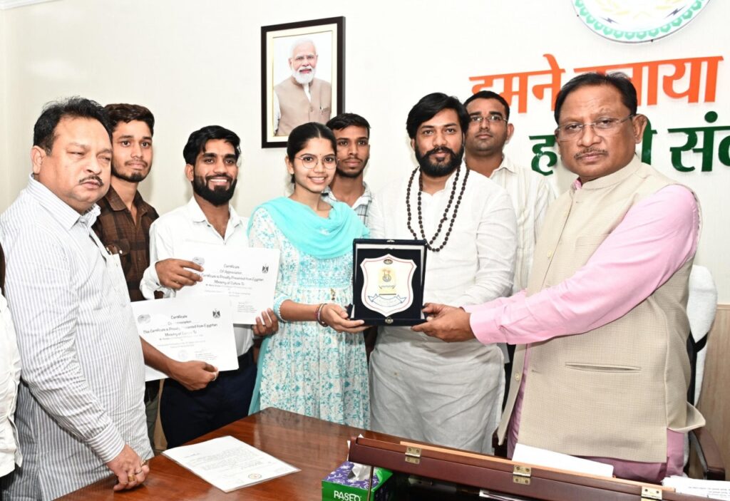 रायपुर, 2 जुलाई 2025 : मुख्यमंत्री श्री विष्णुदेव साय से उनके निवास कार्यालय में पंथी नृत्य दल ने सौजन्य मुलाकात की। पंथी नृत्य दल के सदस्यों ने बताया कि वे 13 से 24 फरवरी 2025 तक मिस्र (इजिप्ट) में आयोजित अंतर्राष्ट्रीय सांस्कृतिक महोत्सव में भारत का प्रतिनिधित्व कर चुके है। मुख्यमंत्री श्री साय ने पंथी नृत्य दल के सभी कलाकारों को अपने कला-प्रदर्शन के माध्यम से विदेश की धरती पर छत्तीसगढ़ की माटी की सुगंध बिखेरने के लिए बधाई और शुभकामनाएं दीं। इस अवसर पर विधायक श्री खुशवंत सिंह साहेब उपस्थित थे।