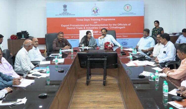 रायपुर, 22 जुलाई 2025 : छत्तीसगढ़ में रैम्प (RAMP) योजना के तहत जिला व्यापार एवं उद्योग केंद्रों के अधिकारियों के लिए ‘निर्यात प्रक्रियाएँ और प्रलेखन‘ विषय पर तीन दिवसीय क्षमता विकास प्रशिक्षण कार्यक्रम का सफल आयोजन किया गया। यह प्रशिक्षण 19 से 21 जुलाई 2025 तक रायपुर स्थित उद्योग भवन में संपन्न हुआ, जिसे एक्सपोर्ट फैसिलिटेशन सेंटर और भारतीय विदेश व्यापार संस्थान कोलकाता के सहयोग से आयोजित किया गया। यह प्रशिक्षण कार्यक्रम अधिकारियों को अपने जिलों में निर्यात को बढ़ावा देने और स्थानीय उत्पादों को वैश्विक बाजारों तक पहुंचाने की दिशा में दक्ष और समर्थ बनाने में महत्वपूर्ण सिद्ध हुआ है।