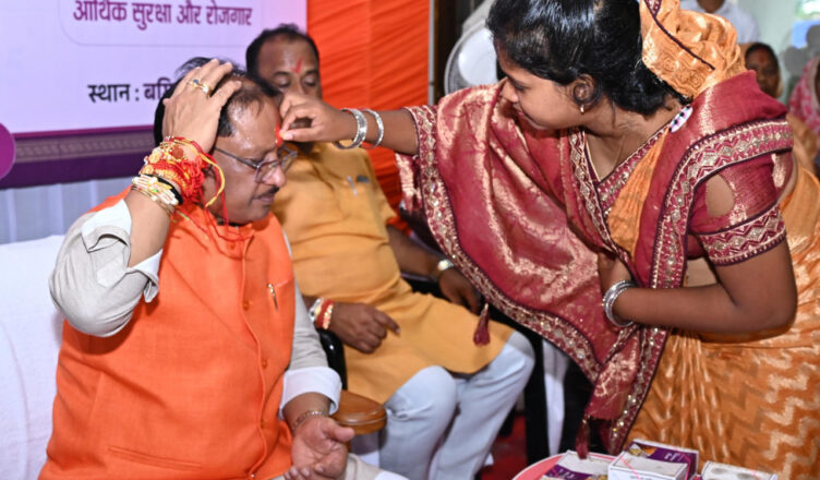 रायपुर, 09 अगस्त 2025 : मुख्यमंत्री श्री विष्णु देव साय के गृह ग्राम बगिया स्थित कैंप कार्यालय में रक्षाबंधन के अवसर पर विभिन्न योजनाओं से लाभान्वित बहनों ने राखी बांधकर आभार व्यक्त किया। प्रधानमंत्री आवास योजना, महतारी वंदन योजना की हितग्राही दीदियों के साथ आंगनबाड़ी कार्यकर्ता-सहायिकाएँ, मितानिन और स्व-सहायता समूह की बहनों ने भी मुख्यमंत्री श्री साय की कलाई पर राखी बांधी और उनके दीर्घायु की कामना की।
