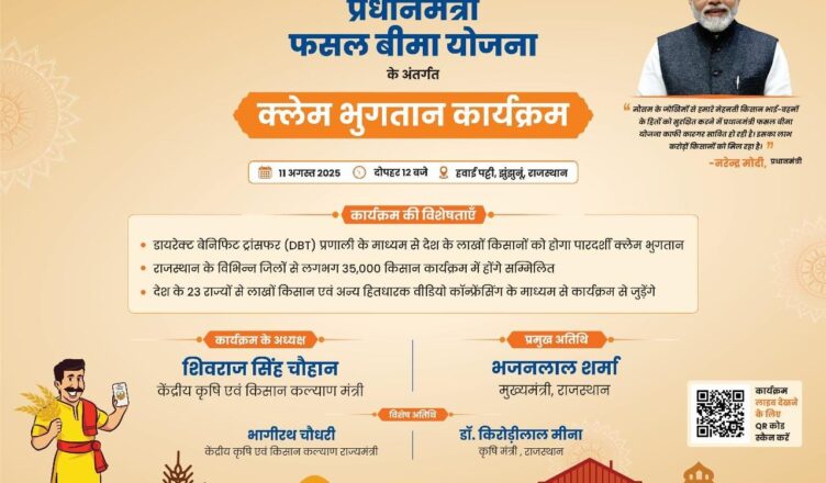 प्रधानमंत्री फसल बीमा योजना के अंतर्गत यह भुगतान 11 अगस्त 2025 (सोमवार) को राष्ट्रव्यापी प्रत्यक्ष लाभ हस्तांतरण आधारित स्वचालित प्रणाली के माध्यम से केंद्रीय कृषि एवं किसान कल्याण मंत्री श्री शिवराज सिंह चौहान की अध्यक्षता में राजस्थान के झुंझुनू में आयोजित कार्यक्रम में होगी। इस अवसर पर आयोजित कार्यक्रम के मुख्य अतिथि राजस्थान के मुख्यमंत्री श्री भजनलाल शर्मा होंगे। कार्यक्रम में केन्द्रीय कृषि एवं किसान कल्याण मंत्री श्री भागीरथ चौधरी, राजस्थान के कृषि मंत्री डॉ. किरोड़ीेलाल मीना विशिष्ट अतिथि होंगे।
