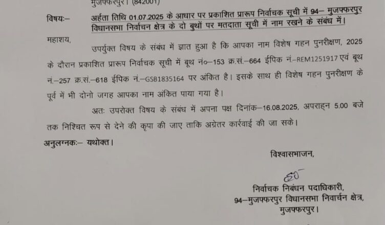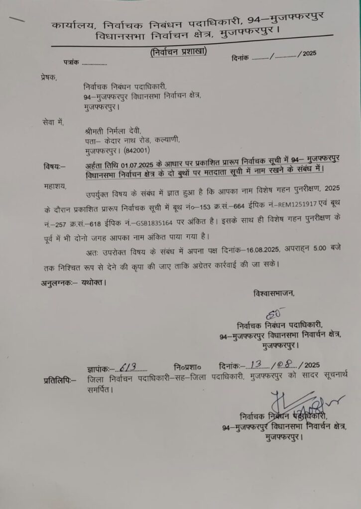 पटना (SHABD): बिहार के नेता प्रतिपक्ष तेजस्वी यादव ने मुजफ्फरपुर की मेयर निर्मला देवी पर आरोप लगाया है कि उनके पास दो वोटर आईडी हैं। इसी मामले में निर्वाचक निबंधन पदाधिकारी ने आज उन्हें नोटिस जारी किया है। नोटिस में निर्मला देवी को निर्देश दिया गया है कि वे इस आरोप पर अपना जवाब 16 अगस्त की शाम 5 बजे तक प्रस्तुत करें।