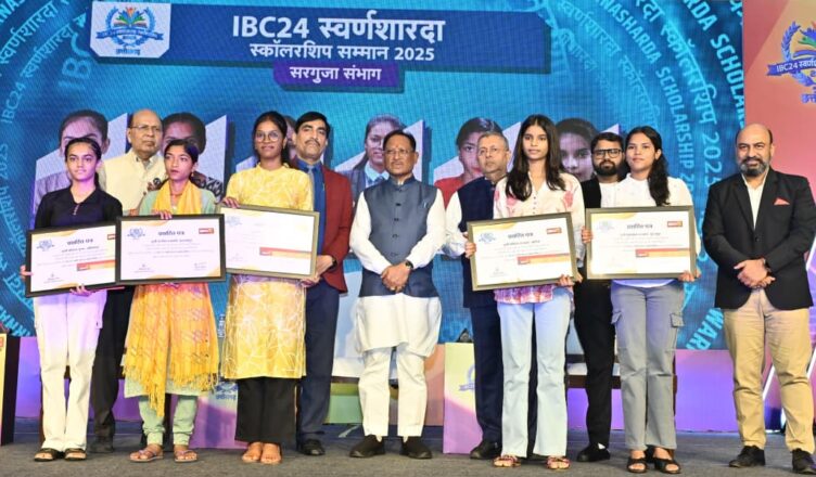 रायपुर, 16 अगस्त 2025 : मुख्यमंत्री श्री विष्णु देव साय ने आज राजधानी रायपुर में आयोजित आईबीसी 24 स्वर्ण शारदा स्कॉलरशिप कार्यक्रम में 12वीं कक्षा की प्रवीण्य सूची में स्थान प्राप्त करने वाली प्रदेश की बेटियों को सम्मानित किया और उन्हें सहायता राशि के चेक प्रदान किए।