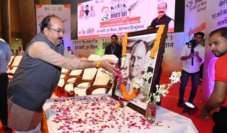 रायपुर. 29 अगस्त 2025 : उप मुख्यमंत्री तथा खेलकूद एवं युवा कल्याण मंत्री श्री अरुण साव आज राजधानी रायपुर के पंडित दीनदयाल उपाध्याय ऑडिटोरियम में राष्ट्रीय खेल दिवस के आयोजन में शामिल हुए। ‘हॉकी के जादूगर’ के नाम से मशहूर मेजर ध्यानचंद की जयंती पर पूरे देश में आज राष्ट्रीय खेल दिवस मनाया जा रहा है। कार्यक्रम में उनकी तस्वीर पर माल्यार्पण कर उनका पुण्य स्मरण किया गया। राष्ट्रीय खेल दिवस पर विविध आयोजनों के बीच उप मुख्यमंत्री श्री अरुण साव के आह्वान पर खिलाड़ियों ने ‘हर गली हर मैदान, खेले सारा हिंदुस्तान’ के जोरदार नारे से पंडित दीनदयाल उपाध्याय ऑडिटोरियम को गूंजा दिया।