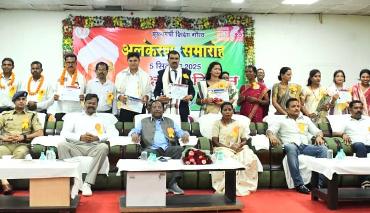 रायपुर, 07 सितंबर 2025 : रजत जयंती वर्ष एवं शिक्षक दिवस के अवसर पर बलरामपुर मुख्यालय के बाजारपारा स्थित ऑडिटोरियम भवन में जिला स्तरीय शिक्षक सम्मान समारोह कार्यक्रम का आयोजन किया गया। कृषि मंत्री श्री रामविचार नेताम मुख्य अतिथि के रूप में शामिल हुए और उपस्थित शिक्षकों को बधाई एवं शुभकामनाएँ दी। इस मौके पर मंत्री श्री नेताम ने उत्कृष्ट शिक्षकों को सम्मानित किया।