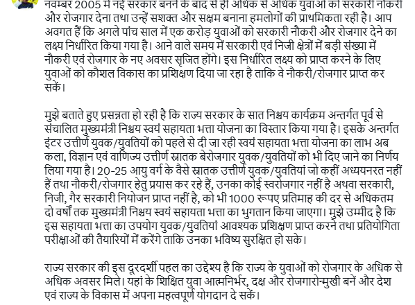 विधानसभा चुनाव से पहले मुख्यमंत्री नीतीश कुमार की ओर से की जा रही घोषणाओं की कड़ी में यह एक महत्वपूर्ण निर्णय है। आज, सोशल मीडिया पर किए गए एक पोस्ट में मुख्यमंत्री नीतीश कुमार ने स्वयं सहायता भत्ता योजना के विस्तार की घोषणा की है।