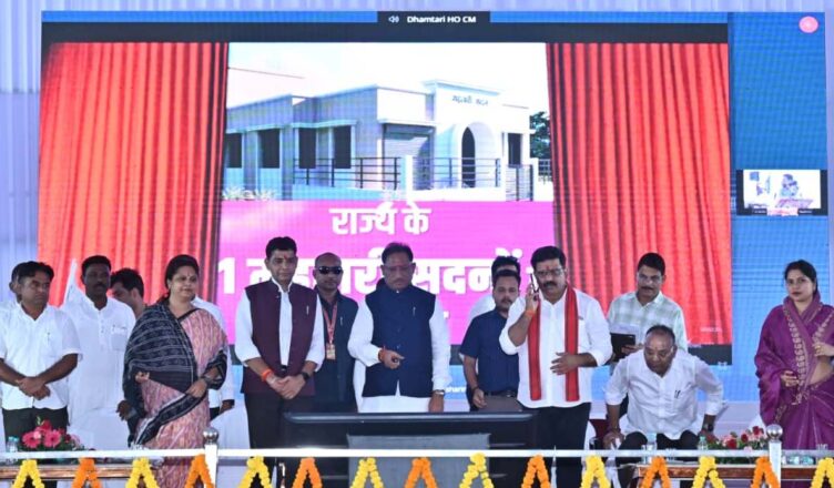 रायपुर, 23 सितम्बर 2025 : मुख्यमंत्री श्री विष्णु देव साय आज धमतरी जिले के कुरूद विधानसभा क्षेत्र के ग्राम करेली बड़ी में आयोजित प्रदेश स्तरीय महतारी सदन लोकार्पण समारोह में शामिल हुए। उन्होंने करेली बड़ी में मंच से राज्य के विभिन्न जिलों में नव निर्मित 51 महतारी सदनों का रिमोट से बटन दबाकर वर्चुअल शुभारंभ किया। इसके साथ ही ग्राम संपदा एप तथा मनरेगा की समग्र जानकारी आधारित नागरिक सूचना पोर्टल का भी शुभारंभ किया। इसके अलावा ’लखपति दीदी/महतारी सदन’ और ’’माँ अभियान’’ पुस्तिका का विमोचन भी किया।