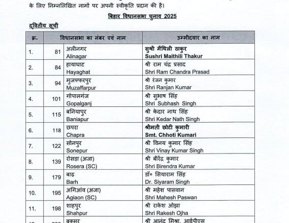 पटना (SHABD) : भारतीय जनता पार्टी (भाजपा) ने आगामी बिहार विधानसभा चुनाव 2025 के लिए आज अपनी दूसरी सूची जारी कर दी है। इस सूची में 12 उम्मीदवारों के नाम शामिल हैं, जिनमें हाल ही में पार्टी में शामिल हुईं लोक गायिका मैथिली ठाकुर और पूर्व आईपीएस अधिकारी आनंद मिश्रा जैसे प्रमुख चेहरे शामिल हैं।