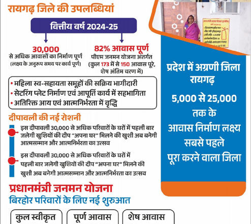 रायगढ़ जिले में वित्तीय वर्ष 2024-25 में स्वीकृत आवासों में से इन 30 हजार से अधिक घरों का निर्माण समय पर पूरा होना न केवल प्रशासनिक दक्षता का उदाहरण है, बल्कि यह ग्रामीण हितग्राहियों के जीवन में स्थायित्व और सम्मान का नया अध्याय भी जोड़ रहा है। इस बार दीपावली उनके लिए वास्तव में विशेष होगी, क्योंकि इस बार दीये उन घरों में जलेंगे, जिनकी दीवारें खुद उनकी मेहनत, उम्मीदों और सरकारी योजनाओं की संवेदनशीलता की कहानी कह रही हैं।