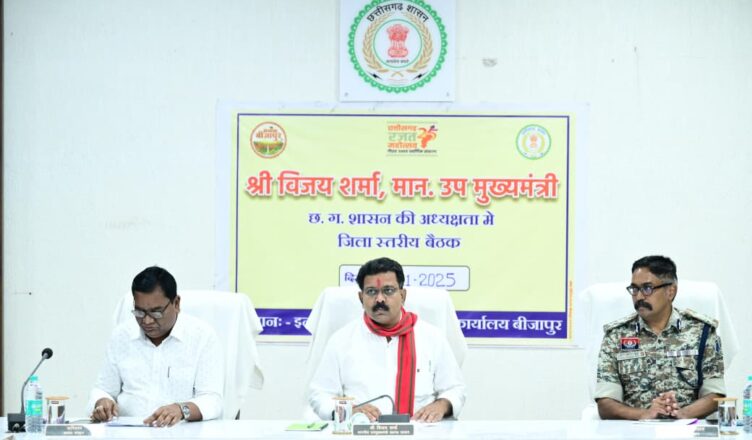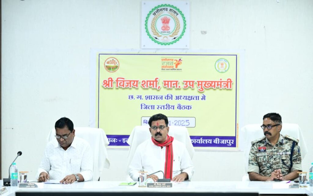 रायपुर, 09 नवंबर 2025 : छत्तीसगढ़ शासन के उपमुख्यमंत्री एवं गृहमंत्री श्री विजय शर्मा ने अपने बीजापुर जिले के दो दिवसीय प्रवास के दौरान आज इन्द्रावती सभाकक्ष में नक्सल उन्मूलन एवं अंदरूनी क्षेत्रों में विकास कार्यों की समीक्षा बैठक ली। इस बैठक में उन्होंने नक्सल उन्मूलन की गतिविधियों, नवस्थापित सुरक्षा कैम्पों की स्थिति, उनके संचालन से आए सकारात्मक सामाजिक बदलावों तथा उन क्षेत्रों में चल रहे विकास कार्यों की प्रगति की जानकारी ली।