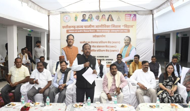 रायपुर, 15 नवंबर 2025 : कृषि मंत्री श्री राम विचार नेताम ने आज बलरामपुर में ग्रामीण स्वरोजगार प्रशिक्षण केंद्र (आरसेटी), संगवारी जेंडर संसाधन केंद्र (जीआरसी) तथा समुदाय प्रबंधित ट्रेनिंग सेंटर (सीएमसीटी) का उद्घाटन किया। मंत्री श्री नेताम ने केंद्र के प्रशिक्षण कक्षों, शयनकक्ष, भोजनकक्ष, रसोईकक्ष का बारीकी से अवलोकन किया और संचालित गतिविधियों की जानकारी ली।
