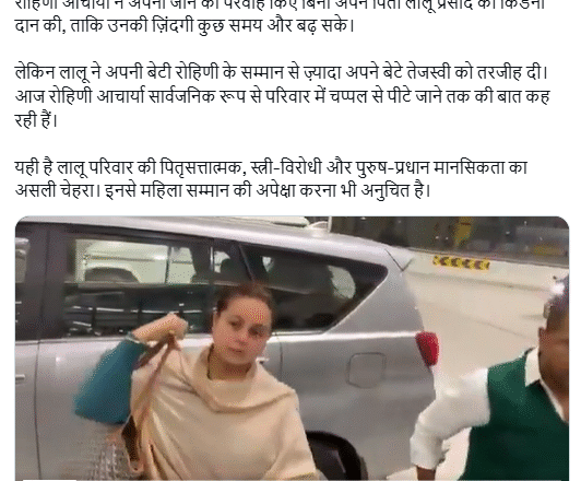 सोशल मीडिया प्लेटफॉर्म एक्स पर लिखा, ‘’रोहिणी आचार्या ने अपनी जान की परवाह किए बिना अपने पिता लालू प्रसाद को किडनी दान की, ताकि उनकी ज़िंदगी कुछ समय और बढ़ सके। लेकिन लालू ने अपनी बेटी रोहिणी के सम्मान से ज़्यादा अपने बेटे तेजस्वी को तरजीह दी। आज रोहिणी आचार्या सार्वजनिक रूप से परिवार में चप्पल से पीटे जाने तक की बात कह रही हैं। यही है लालू परिवार की पितृसत्तात्मक, स्त्री-विरोधी और पुरुष-प्रधान मानसिकता का असली चेहरा। इनसे महिला सम्मान की अपेक्षा करना भी अनुचित है।”
