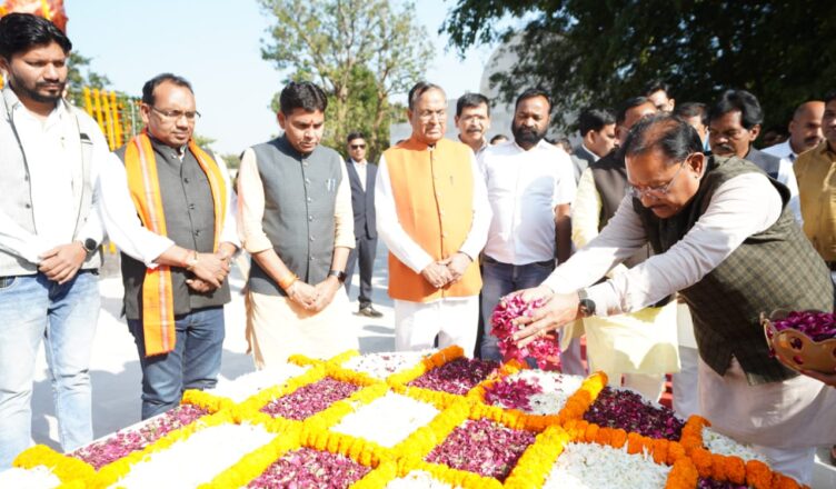 रायपुर, 10 दिसम्बर 2025:मुख्यमंत्री श्री विष्णु देव साय आज बलिदान दिवस पर आयोजित श्रद्धांजलि समारोह में शहीद वीर नारायण सिंह की जन्मभूमि एवं कर्मभूमि कसडोल विकासखंड के ग्राम सोनाखान पहुंचे। उन्होंने सोनाखान स्थित शहीद स्मारक में श्रद्धासुमन अर्पित किया एवं शहीद वीर नारायण सिंह के आदमकद मूर्ति पर माल्यार्पण कर उन्हें श्रद्धांजलि दी। इस दौरान मुख्यमंत्री ने शहीद वीर नारायण सिंह संग्रहालय का भी अवलोकन किया। इस अवसर पर कैबिनेट मंत्री श्री रामविचार नेताम, श्री केदार कश्यप, श्री टंकराम वर्मा, पूर्व विधानसभा अध्यक्ष गौरीशंकर अग्रवाल,पूर्व विधायक बिलाईगढ़ डॉ सनम जागड़े, शहीद वीर नारायण सिंह के वंशज राजेंद्र दीवान सहित अन्य जनप्रतिनिधिगण उपस्थित थे।