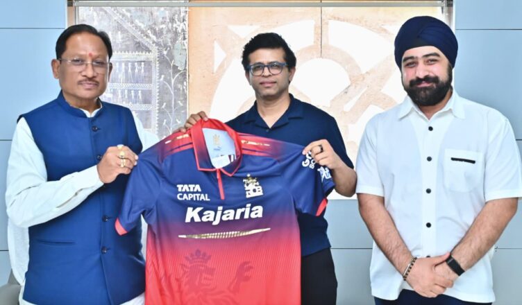 रायपुर, 13 जनवरी 2026 :रॉयल चैलेंजर्स बेंगलुरु (RCB) की ओर से मुख्यमंत्री श्री विष्णु देव साय को टीम का आधिकारिक जर्सी भेंट कर रायपुर में प्रस्तावित आईपीएल मैच के आयोजन के लिए औपचारिक रूप से आमंत्रित किया गया। इस अवसर पर आरसीबी के वाइस प्रेसिडेंट श्री राजेश मेनन तथा भारतीय क्रिकेट कंट्रोल बोर्ड (BCCI) के संयुक्त सचिव श्री प्रभतेज सिंह भाटिया उपस्थित थे।
