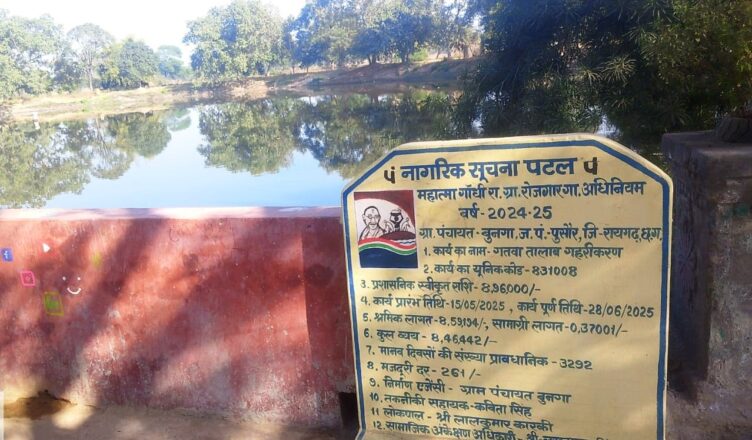 रायपुर ,14 जनवरी 2026 :मुख्यमंत्री श्री विष्णु देव साय के सुशासन और सहभागी विकास की अवधारणा से राज्य सरकार की जल संरक्षण-संवर्धन नीति और मनरेगा जैसी जनकल्याणकारी योजनाओं के प्रभावी क्रियान्वयन से गाँव-गाँव में जल स्रोतों का पुनर्जीवन हो रहा है। इसी दूरदर्शी सोच का सशक्त उदाहरण रायगढ़ जिला अंतर्गत जनपद पंचायत पुसौर के ग्राम पंचायत बुनगा में देखने को मिला है, जहाँ मनरेगा योजना के तहत गतवा तालाब का गहरीकरण एवं जीर्णाेद्धार कार्य सफलतापूर्वक पूर्ण किया गया। यह कार्य न केवल जल संकट के समाधान की दिशा में एक बड़ा कदम है, बल्कि ग्रामीण आजीविका, कृषि और आर्थिक सशक्तिकरण की दिशा में भी मील का पत्थर साबित हो रहा है।