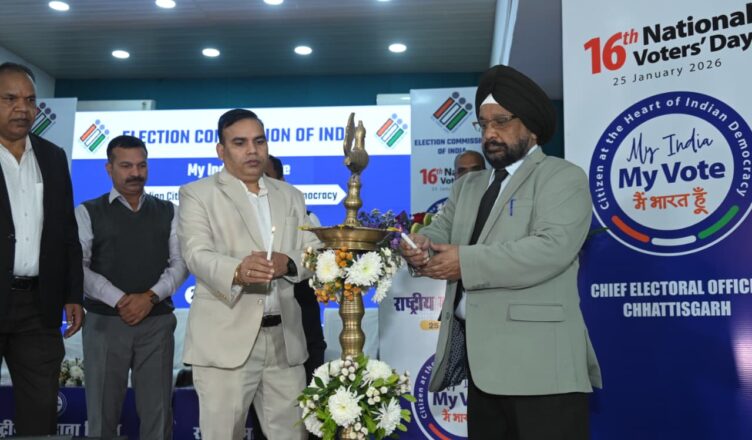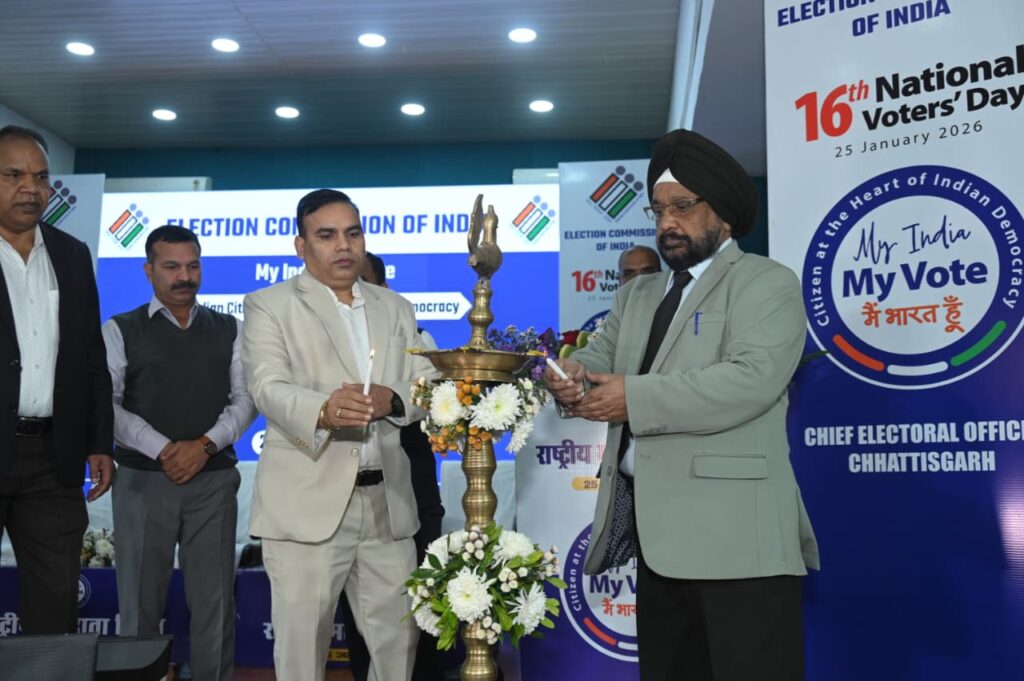 रायपुर, 25 जनवरी 2026 : 16वें राष्ट्रीय मतदाता दिवस के अवसर पर आज इंदिरा गांधी कृषि विश्वविद्यालय, रायपुर स्थित विवेकानंद सभागार में भव्य राज्य स्तरीय समारोह का आयोजन किया गया। कार्यक्रम का शुभारंभ मुख्य अतिथि न्यायमूर्ति श्री इंदर सिंह उबोवेजा, प्रमुख लोकायुक्त, छत्तीसगढ़ लोक आयोग द्वारा दीप प्रज्ज्वलन कर किया गया। इस अवसर पर उन्होंने कार्यक्रम स्थल पर आयोजित मतदाता जागरूकता प्रदर्शनी का उद्घाटन कर उसका अवलोकन भी किया।