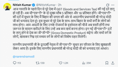सीएम नीतीश ने जीएसटी सुधारों को बताया ‘खुशहाली का पैगाम’, पीएम मोदी का जताया आभार 22/09/2025Ashish Jha पटना, 22 सितंबर 2025 (SHABD): मुख्यमंत्री नीतीश कुमार ने जीएसटी दरों में बड़े स्तर पर कटौती और सुधार के लिए प्रधानमंत्री नरेंद्र मोदी [...]