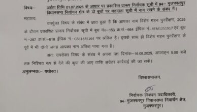 निर्वाचन आयोग ने मुजफ्फरपुर की मेयर को जारी किया नोटिस 13/08/202513/08/2025Ashish Jha पटना (SHABD): बिहार के नेता प्रतिपक्ष तेजस्वी यादव ने मुजफ्फरपुर की मेयर निर्मला देवी पर आरोप लगाया है कि उनके पास दो वोटर [...]