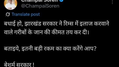 पूर्व मुख्यमंत्री चंपाई सोरेन ने राज्य सरकार पर लगाया “जान की कीमत” लगाने का आरोप 11/10/202511/10/2025Ashish Jha रांची (SHABD) :राज्य के पूर्व मुख्यमंत्री चंपाई सोरेन ने भी स्वास्थ्य व्यवस्था पर प्रश्नचिन्ह खड़े किए हैं। एक सोशल मीडिया पोस्ट में श्री [...]